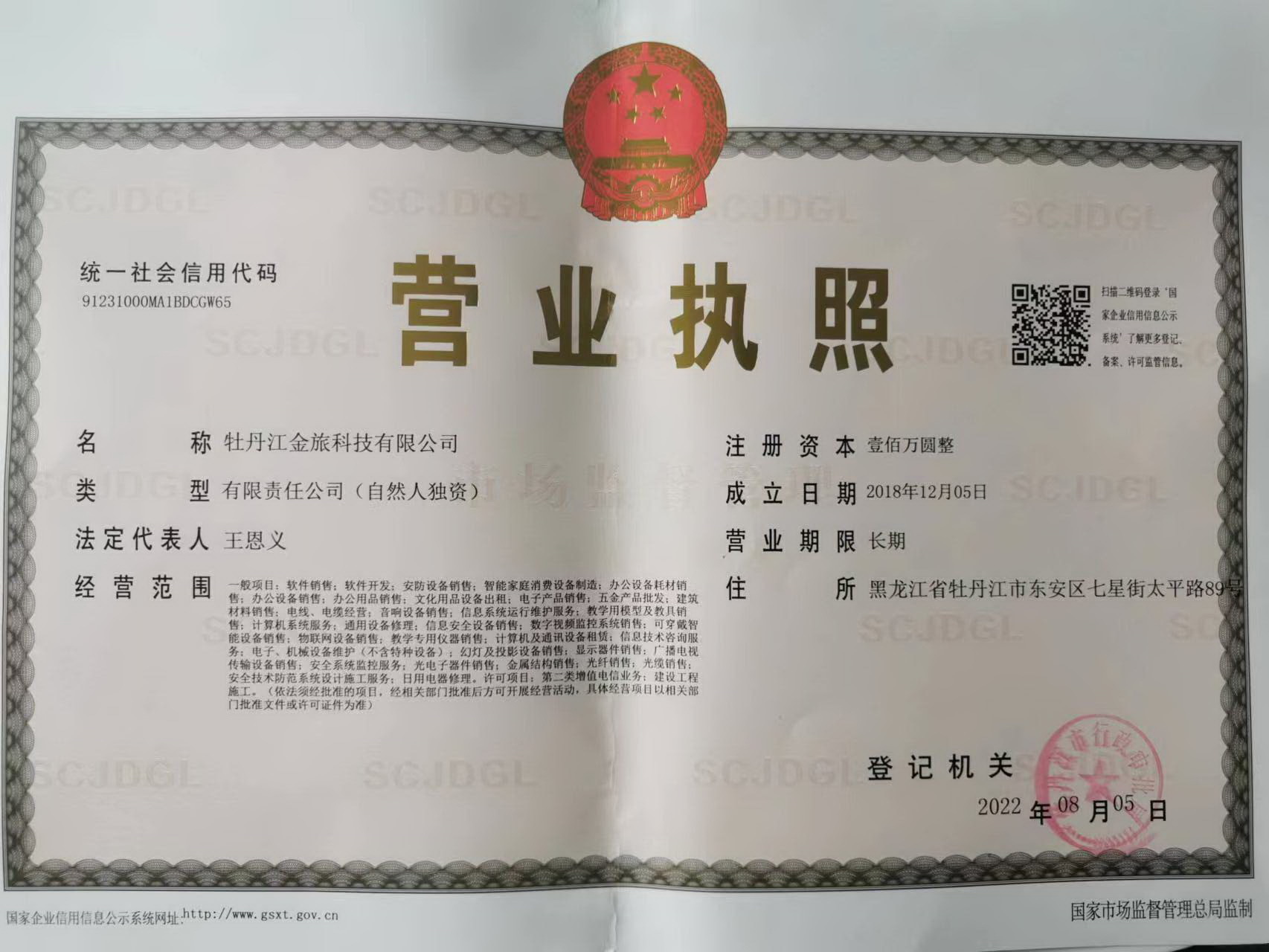 牡丹江金旅科技有限公司于2018年12月5日成立,注册地位于牡丹江市东安区七星街太平路89号,法定代表人为王恩义。经营范围软件开发及销售;计算机系统集成;安防产品销售及售后服务;楼宇智能化安装;销售办公设备及耗材、智能安居、通讯产品、电子产品、五金交电、机电设备、电线电缆。电子计算机、监控器材、打印机、传真机、一体机、投影机、电视电话会议系统、音响设备、自动化控制设备销售、安装及维修;智能家居的设计安装;网络综合布线;网络(站)设计与维护;办公自动化设备及耗材、电子考勤系统、电子检测系统、教学设备、电子教具、多媒体设备、通讯设备的设计、安装与维修;监控设备工程;安防工程;室内外大屏幕工程的设计、施工与维修;五金交电批发与零售。